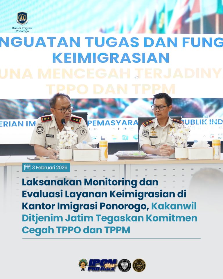 Laksanakan Monitoring dan Evaluasi Layanan Keimigrasian di Kantor Imigrasi Ponorogo, Kakanwil Ditjenim Jatim Tegaskan Komitmen Cegah TPPO dan TPPM