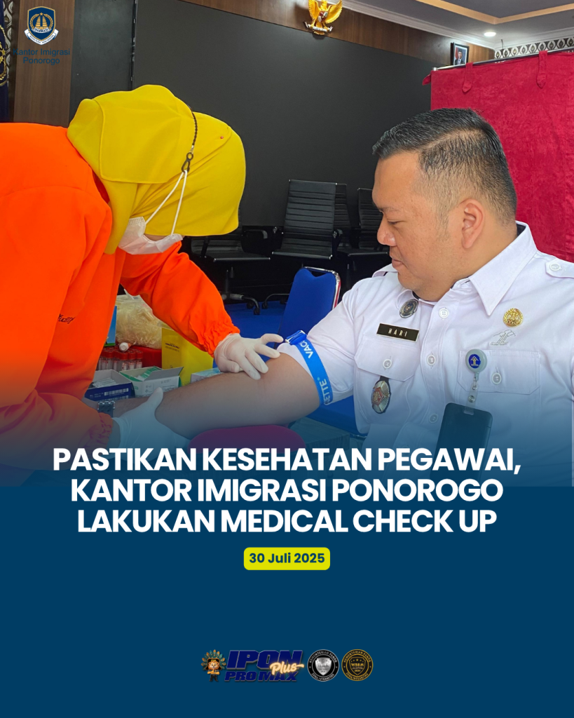 PASTIKAN KESEHATAN PEGAWAI, KANTOR IMIGRASI PONOROGO LAKUKAN MEDICAL CHECK UP Guna memastikan kesehatan pegawai tetap terjaga dan mendukung terciptanya lingkungan kerja yang aman dan produktif, Kantor Imigrasi Ponorogo laksanakan Medical Check Up (MCU) pada Rabu, 30 Juli 2025. Kegiatan ini bekerja sama dengan Laboratorium Medis dan Klinik Pramita Madiun. Dalam MCU tersebut, setiap pegawai […]