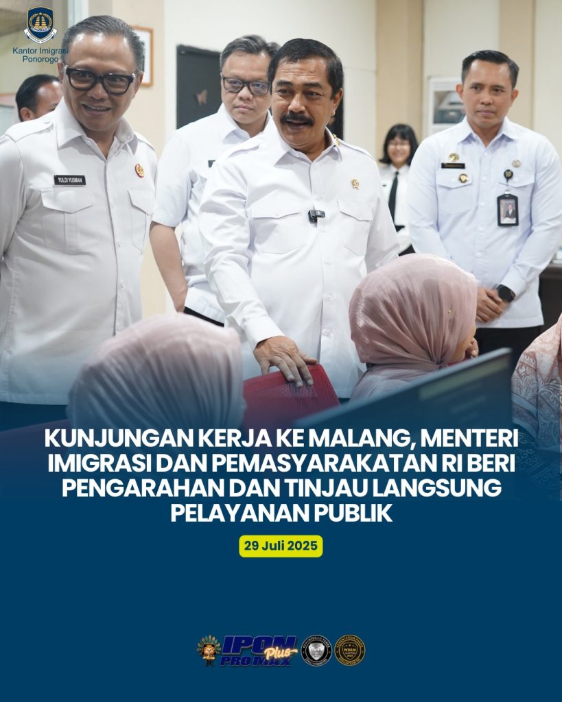 Kunjungan Kerja ke Malang, Menteri Imigrasi dan Pemasyarakatan RI Beri Pengarahan dan Tinjau Langsung Pelayanan Publik MALANG – Menteri Imigrasi dan Pemasyarakatan Republik Indonesia (IMIPAS), Agus Andrianto, melaksanakan kunjungan kerja ke Malang pada Selasa (29/07/2025). Bertempat di Kantor Imigrasi Kelas I TPI Malang, Plh Kantor Imigrasi Ponorogo, Muhammad Hari Ariyansyah, beserta Kepala Satuan Kerja Imigrasi […]