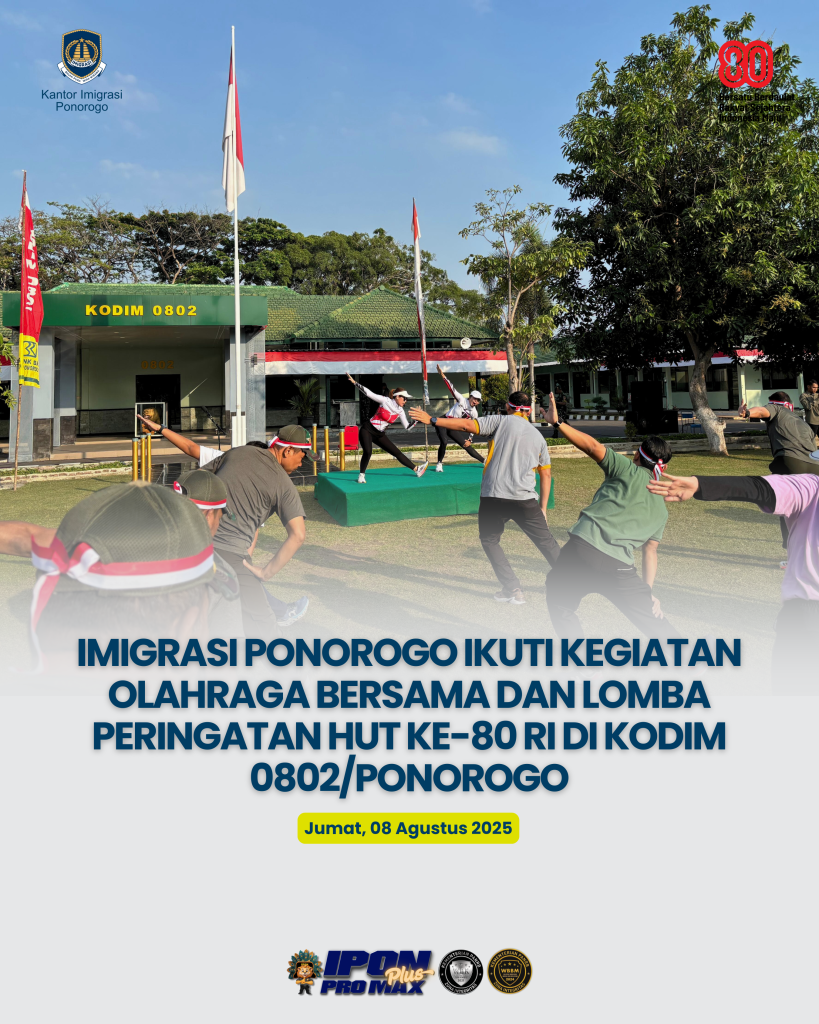 Imigrasi Ponorogo Ikuti Kegiatan Olahraga Bersama dan Lomba Peringatan HUT ke-80 RI di Kodim 0802/Ponorogo PONOROGO – Kantor Imigrasi Ponorogo menghadiri undangan Komandan Komando Distrik Militer (Kodim) 0802 Ponorogo untuk mengikuti kegiatan olahraga bersama dan perlombaan dalam rangka memeriahkan peringatan HUT ke-80 Kemerdekaan Republik Indonesia Tahun 2025, Jumat (8/8/2025), bertempat di Lapangan Kodim 0802 Ponorogo. […]