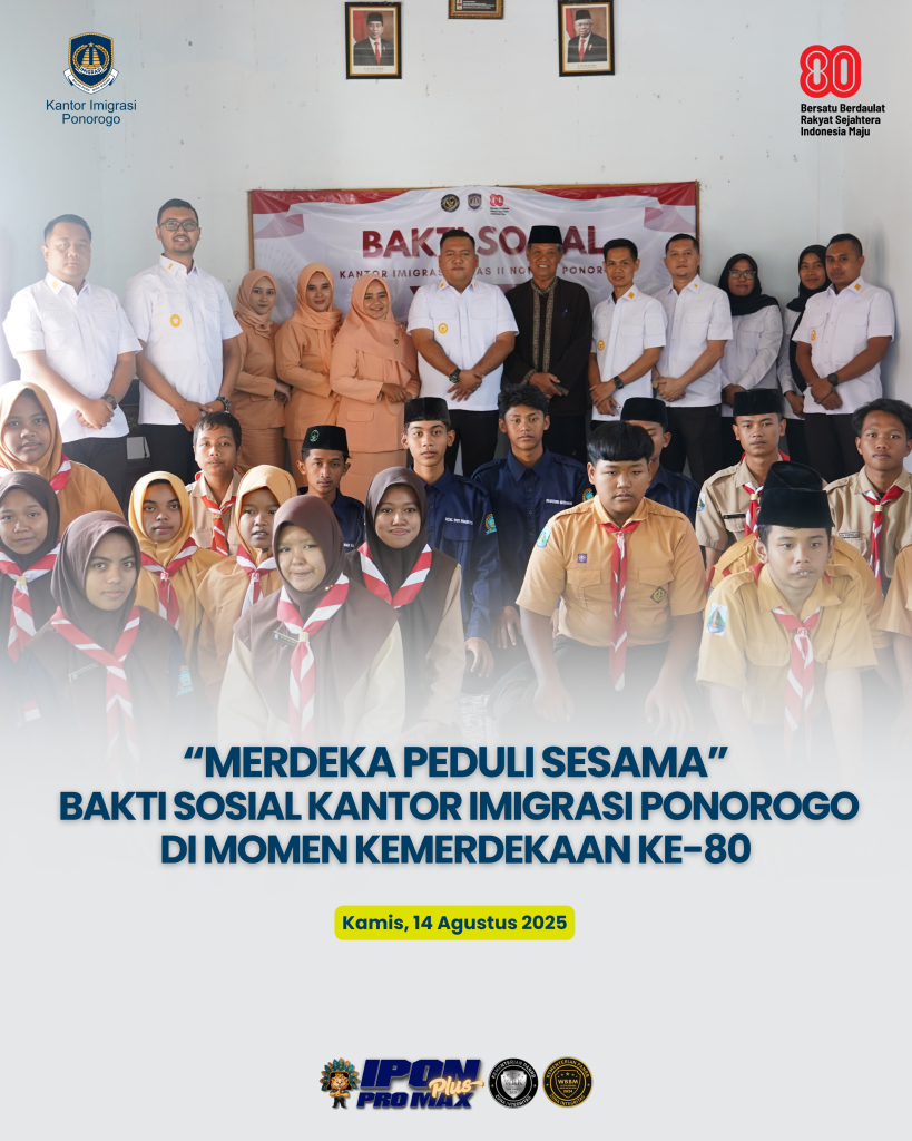 “MERDEKA PEDULI SESAMA” BAKTI SOSIAL KANTOR IMIGRASI PONOROGO DI MOMEN KEMERDEKAAN KE-80 Ponorogo – Dalam rangka memperingati HUT ke-80 Kemerdekaan Republik Indonesia, Kantor Imigrasi Ponorogo laksanakan bakti sosial bertajuk “Merdeka Peduli Sesama”, Kamis (14/08). Bertempat di LKSA Panti Asuhan Munirul Islam, kegiatan ini merupakan bentuk kepedulian dan wujud nyata pengabdian kepada masyarakat. Selain itu, dilaksanakan […]