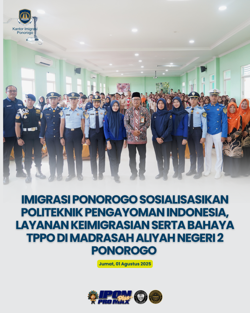 Imigrasi Ponorogo Sosialisasikan Politeknik Pengayoman Indonesia, Layanan Keimigrasian Serta Bahaya TPPO di Madrasah Aliyah Negeri 2 Ponorogo Ponorogo – Kantor Imigrasi Ponorogo bersama dengan Taruna dan Taruni Politeknik Pengayoman Indonesia (Poltekpin) Jurusan Keimigrasian laksanakan kegiatan sosialisasi pengenalan Poltekpin serta Pengenalan Layanan Keimigrasian dan Pencegahan Tindak Pidana Perdagangan Orang (TPPO) di Madrasah Aliyah Negeri (MAN) 2 […]
