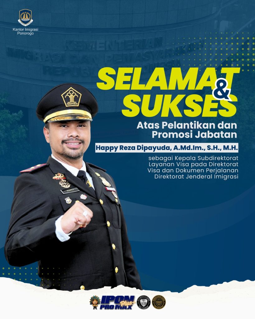 Upacara Pelantikan dan Pengambilan Sumpah Jabatan Pimpinan Tinggi Pratama dan Pejabat Administrasi di lingkungan Kementerian Imigrasi dan Permasyarakatan Jakarta – Upacara Pelantikan dan Pengambilan Sumpah Jabatan Pimpinan Tinggi Pratama dan Pejabat Administrasi di lingkungan Kementerian Imigrasi dan Permasyarakatan, Jumat (01/08/2025). Seluruh jajaran Kantor Imigrasi Ponorogo mengucapkan selamat kepada Bapak Happy Reza Dipayuda atas jabatan baru […]